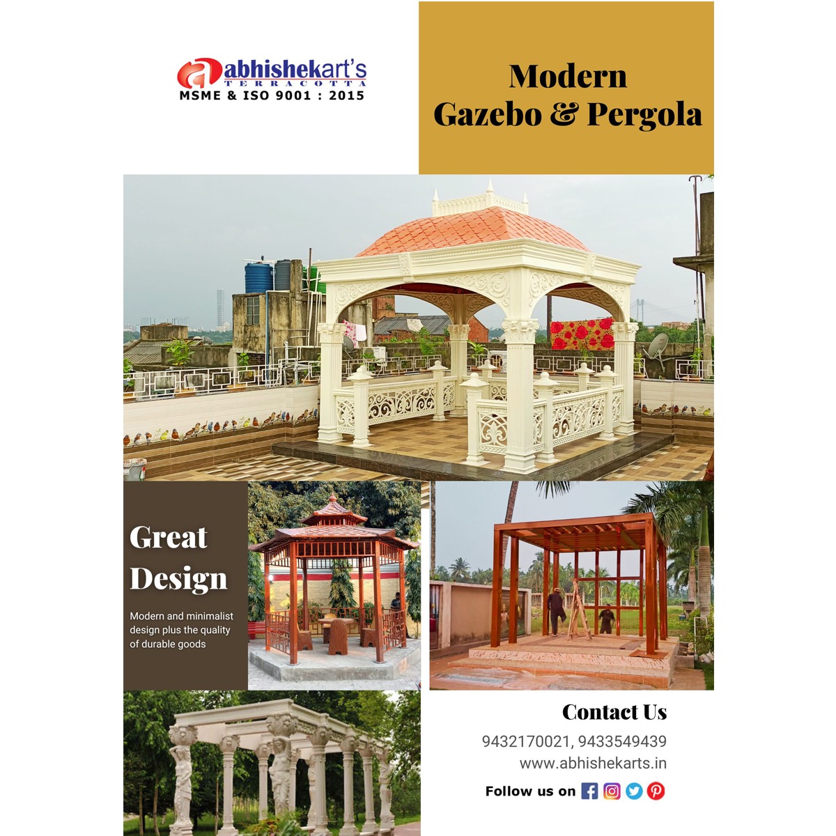 Create elegant outdoor spaces with Abhishek Arts — one of the Best Gazebo and Pergola Manufacturers in India. We specialize in premium-quality FRP Gazebos and Pergolas designed for gardens, resorts, parks, rooftops, hotels, public spaces and private properties across India. ✔️ Gazebo Specifications: Our FRP Gazebos are built with a triple-layer FRP structure, reinforced with inside iron fabrication for superior durability, strength and weather resistance. These gazebos are low-maintenance, long-lasting and ideal for all climates. ✔️ Pergola Specifications: Our Pergolas are manufactured using MS square pipe and box pipe, customized as per design and structural need. The result is a stylish, sturdy and modern outdoor shade system that enhances any landscape. 🎨 Design Options: We offer 20+ elegant Gazebo and Pergola designs — customizable in size, color and finish to match your theme and environment. 🏗️ Why Choose Us? • Premium workmanship • Weather-resistant construction • Strong & safe structural engineering • Pan-India delivery & installation support • Trusted Best Gazebo and Pergola Manufacturer in India If you’re searching for a Top Gazebo and Pergola Manufacturer in India, partner with Abhishek Arts to transform your outdoor space into a beautiful relaxation zone.